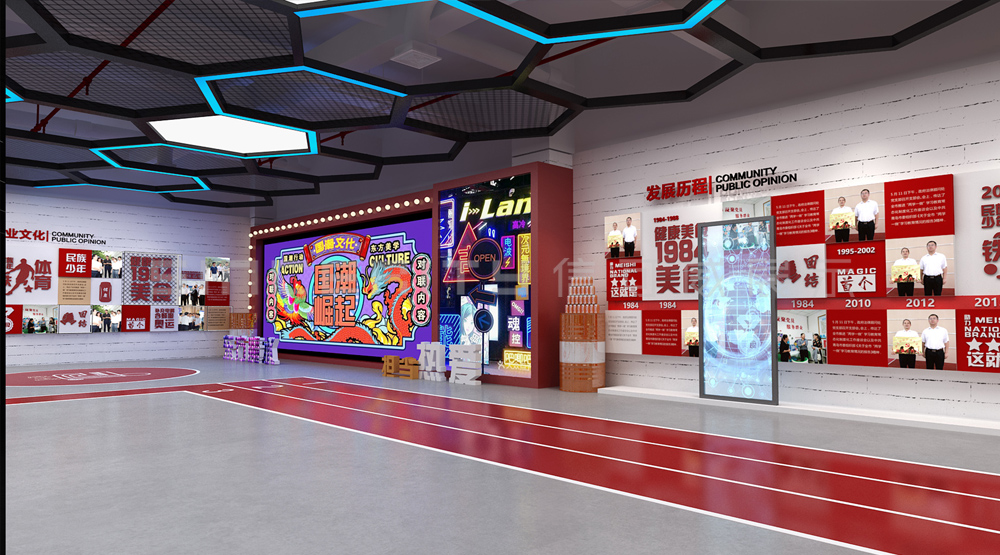 健力寶主題展覽館改造設(shè)計項目,信可威的設(shè)計方案以“科技感、現(xiàn)代感、互動感”為主,貼合健力寶品牌主色調(diào)“中國紅”,融入健力寶企業(yè)文化,簡單的增加國潮性元素,同時凸顯了體育品牌,增加了互動體驗區(qū)拍照區(qū),加強互動體驗感,給參觀者留下深刻印象。