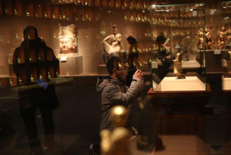 12月13日,中國(guó)國(guó)家博物館,在“中國(guó)古代佛造像”專題展中參觀的觀眾。國(guó)家博物館的佛造像藏品于今年12月10日以全新的面貌重新對(duì)公眾展出。煥然一新的展陳設(shè)計(jì)讓觀眾能夠更好地了解中國(guó)古代佛造像的全貌。